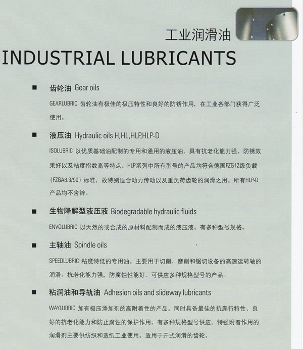 本公司专注于销售水性、油性润滑油,真空泵油,切削油,齿轮油热处理油,防锈油产品系列和润滑脂,如高速润滑油,超耐热温润滑脂等。为客户提供种类齐全的润滑产品的解决方案。